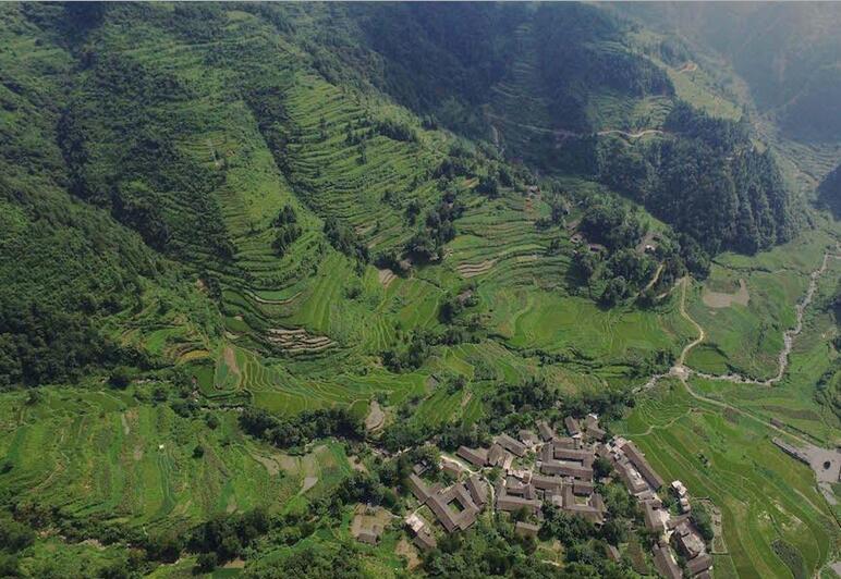 山羊村大致形成于清朝雍正年间,村民多为陈姓,当地村民称为“老主人”的陈洪文周游至此后,被当地的奇峰怪石、云雾清泉所吸引,于是从龙洞井搬迁到这里,并将其命名为山羊坪。清朝末年四川省知名文人陈汝燮的故居也在此。图为航拍山羊村胜境。