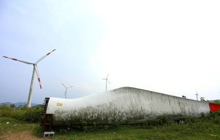 这是一片废弃的风车叶,真的很大吧,站过去都没它高呢。
