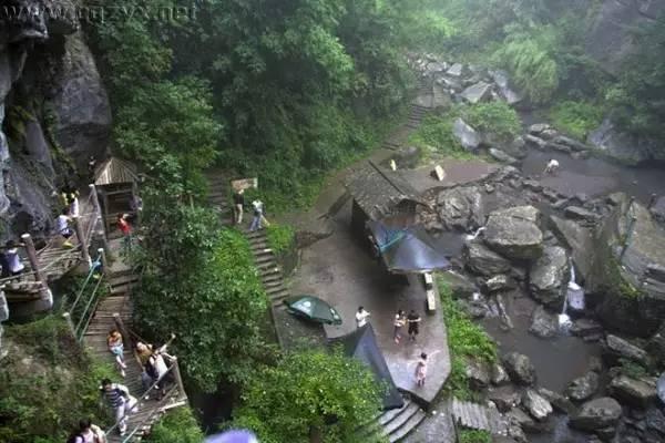 上有古藤倒挂、下有潺潺流水。下段由于流水侵蚀力的作用,有洞穴群生,潭潭相连,飞泉瀑布层层叠叠,石钟乳、石笋、石柱更是千姿百态、变化万千。