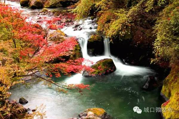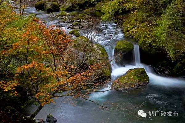 城口的彩叶有山水的陪伴,宛如盛开的花儿开得更加绚烂。