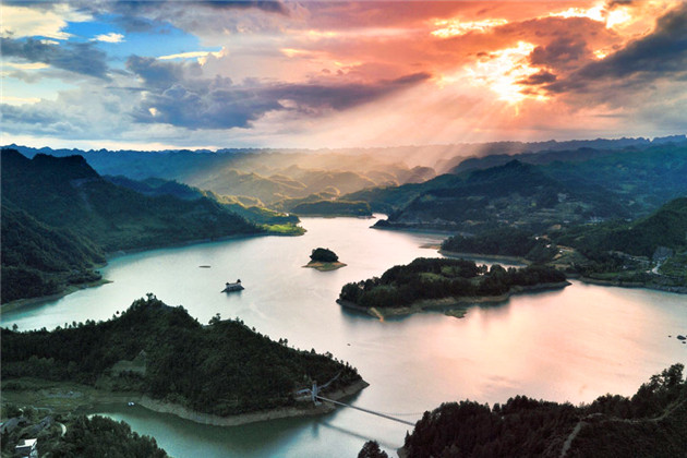 因为渝东南地区的生态环境保护得比较好,所以天空也少见雾霾,当太阳渐渐升起的时候,不仅会把云彩照得通红,还会透过云朵的间隙一束一束地投射到大地上,这山水之色会逐渐被太阳照亮,显示出一派蓬勃向上的活力。