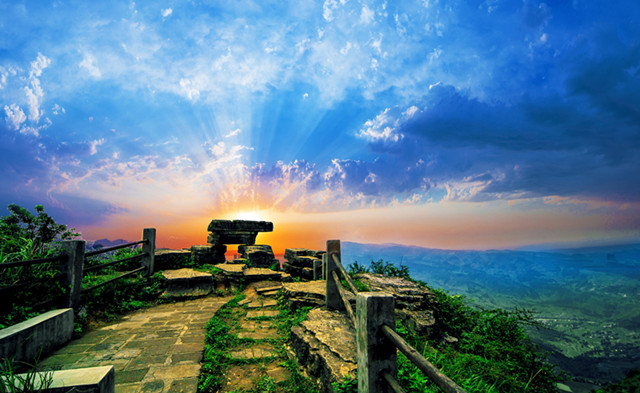 南天门海拔约1600米,因地处渝黔交界,峰峦立南而得名。傍晚时分,夕阳斜照,南瞰贵州,北望重庆,远处的村庄、炊烟、山林、石径都被落日渲染成一片橙黄的海洋,还可览16台壮美风车。