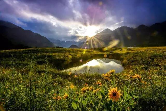 红池坝随处都可观赏晚霞美景,但最佳地点是西流溪边,晚霜洒满草原,天、地、人浑然一体,如诗如画,韵味无穷。