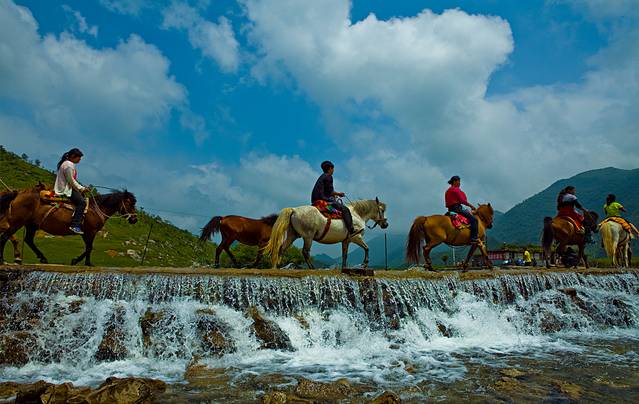除了赏花,这里还有三个水池,虽然相隔不远,但颜色却天然不同。三个池子的水分别是红、青、黑三种不同的颜色。红池水如霞、清池水如靛、黑池水如墨,现名红池坝便是由红池得名。