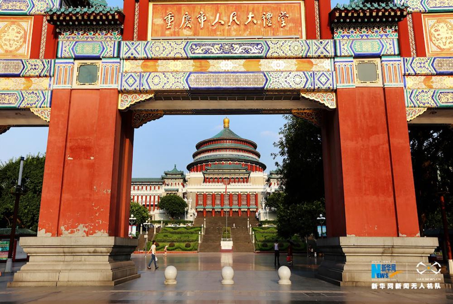 新中国成立后,当时的建设者们决定在重庆建造一座大礼堂,著名建筑师张家德担任大礼堂的设计师,礼堂主体融天坛祈年殿和天安门城楼特点于一体,再配以两翼廊道和塔楼,以明清建筑风格的路线,展现整体建筑的典雅大方。图为航拍重庆人民大礼堂,大礼堂气势雄伟,是中国传统宫殿建筑风格与西方建筑的大跨度结构巧妙结合的杰作。