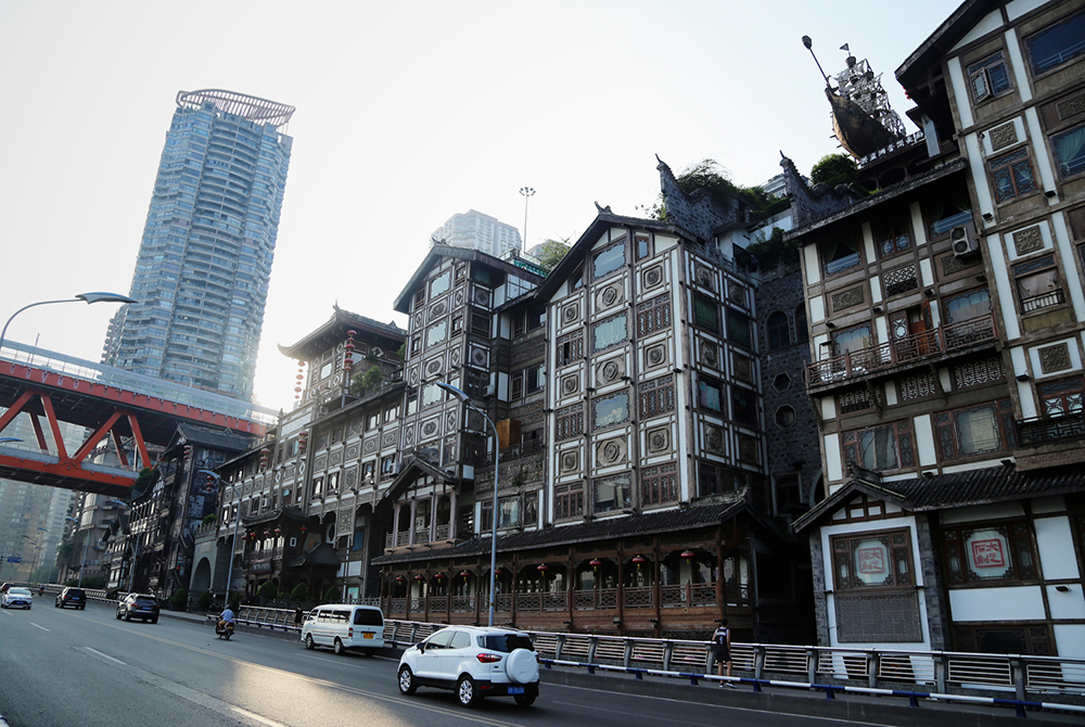 滨江路上车来车往,洪崖洞周边高楼林立,它特有的老山城人文景观却令中外游客痴迷。新华网 彭博摄